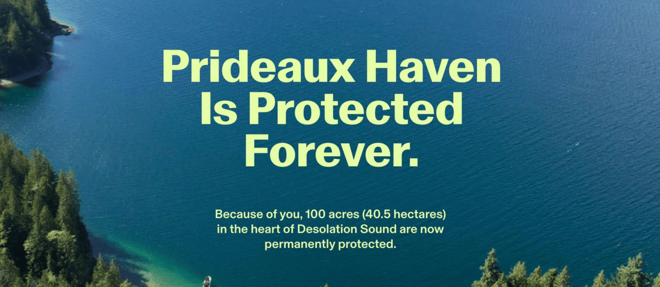Together, donors helped raise an incredible $1.25 million, with another $1.25 million matched by the Wilson 5 Foundation. The funds allowed for the purchase of 100 acres of coastal forest and nearly one kilometre of untouched shoreline in Prideaux Haven.